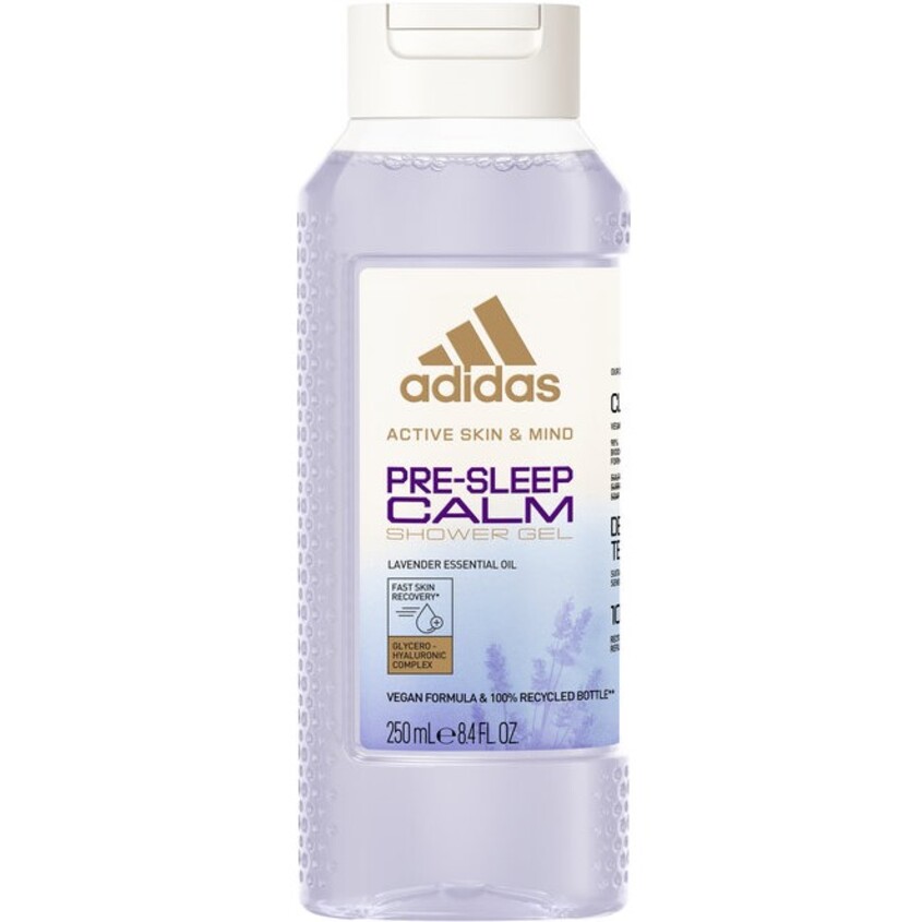 Adidas shower gel active skin & mind pre-sleep calm comforts your senses with relaxing lavender essential oil. its glycero-hyaluronic complex provides fast skin moisture recovery after in-shower cleansing. The clean & vegan formula is suited to even the most sensitive skin. 100% recycled bottle (excl. additives, cap & label).
